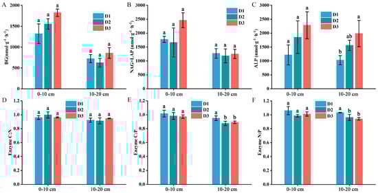 C-acquisition ((A), BG, β-1,4-glucosidase), N-acquisition ((B), NAG+LAP; NAG, β-1,4-N-acetylglucosaminidase; LAP, leucine aminopeptidase), and P-acquisition ((C), ALP, alkaline phosphatase) activities and the corresponding stoichiometries at different stand densities in the 0–10 cm and 10–20 cm soil layers. (D) BG:(NAG+LAP) ratios; (E) BG:ALP ratios; (F) (NAG+LAP):ALP ratios. Different lowercase letters indicate significant differences among the three densities at the p < 0.05 level.