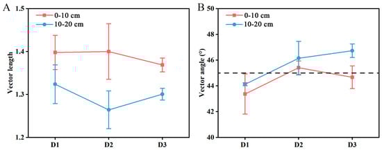 Vector length (L; microbial C limitation) presented different variation patterns in the two soil layers; for example, D2 presented the highest and lowest L values in the 0–10 (1.40 ± 0.06) and 10–20 cm (1.26 ± 0.04) soil layers, respectively. D1 always had relatively high values (1.40 ± 0.04 and 1.32 ± 0.05, respectively). L was greatest in D1 and D2, indicating severe C limitations. The vector angle in D1 was always less than 45° (N limitation), whereas that in D2 was greater than 45° in the two soil layers (P limitation). The vector angle of D3 showed different patterns in the two soil layers (Figure 5).