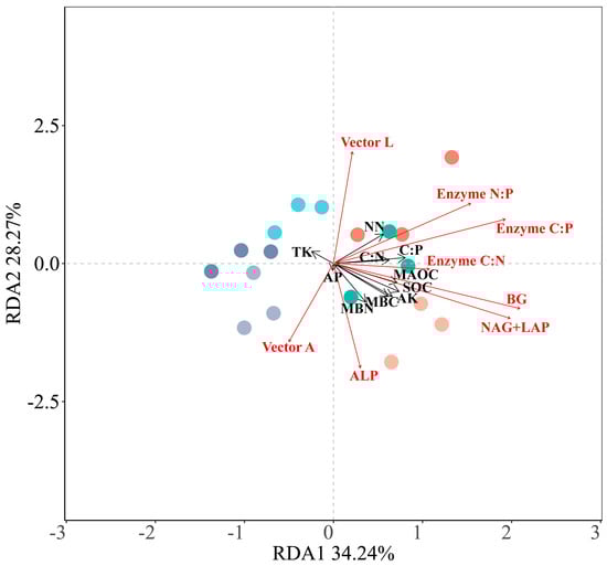 Redundancy analysis of EEA, stoichiometry, vector L, and vector A (red arrows) with soil properties (black arrows).