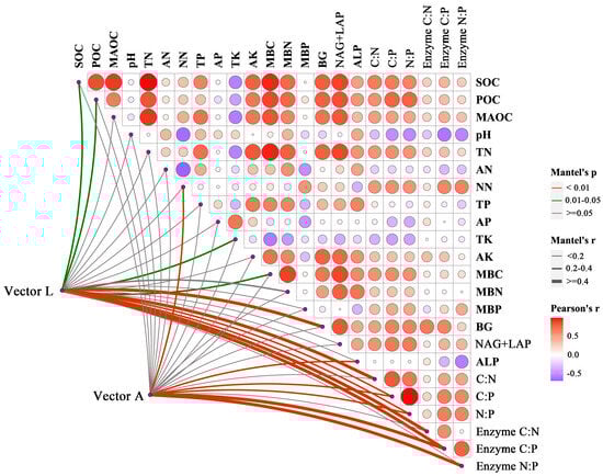 Heatmap showing the Pearson’s correlation (r) and Mantel test results for vector L and vector A with respect to the soil properties, EEA, and stoichiometry. The colors indicate the correlations between pairwise comparisons of variables. The arc width corresponds to Mantel’s r statistic for the corresponding distance correlations, and the arc color indicates the significance of Mantel’s p statistic.