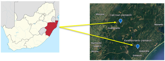 Two trials were conducted in the Kwambonambi area of KwaZulu-Natal province in South Africa (28°36′17″ S 32°05′11″ E). The most widely grown hardwood species in South Africa are eucalypts [38], accounting for about 528,314 ha (44.2%) of the total planted forest area. Out of that, 56.9% is planted in KwaZulu-Natal, predominantly managed for pulpwood production [39]. The KwaZulu-Natal province experiences a subtropical climate with a mean annual temperature (MAT) and mean annual precipitation (MAP) of 22 °C and 1155 mm, respectively [40,41]. Afforested areas are predominantly covered with deep sandy Fernwood soils with good ground conditions. The two experimental sites (Kwambonambi and Flatcrown) were previously planted with Eucalyptus grandis × urophylla and harvested using the mechanised (harvester and forwarder) cut-to-length method. Research sites were selected to match consistency in terrain characteristics and soil conditions. Controlled burning of eucalypt residues was carried out in all the study areas before planting. The Kwambonambi site was characterised by medium residue with weed regrowth, while at Flatcrown, residue presence was low (Table 1). Planting positions were determined using previous rotation stump lines; after that, planting followed, which in the Kwambonambi area is mostly conducted between March and October.