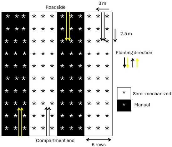 Manual and semi-mechanised planting methods were observed simultaneously on both compartments (Figure 2) divided into six-row wide strips (18 m) for the trial (Table 1). Strips were marked at the roadside with numbered pegs, which were used as a starting point for planting. Each strip represented one observation, and the experiment was organised as a blocked factorial design, with two treatments (e.g., manual and semi-mechanised) randomly distributed at each of the two blocks (e.g., Flatcrown and Kwambonambi) (Figure 3). Overall, the experiment contained 37 observations, distributed as follows: Flatcrown semi-mechanised = 13; Flatcrown manual = 9; Kwambonambi semi-mechanised = 7; and Kwambonambi manual = 8.