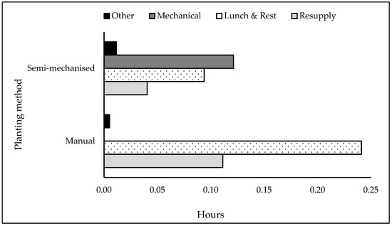 The semi-mechanised method had a higher utilisation than the manual method; that is, it incurred fewer method delays, i.e., those delays when the whole method stopped performing productive work (Figure 5). The highest method delays, the lunch and rest breaks, were recorded with the manual method (67% of the total method delay time). Resupplying of hydrogel and seedlings also had a much higher incidence in the manual method (31%) compared to the semi-mechanised method (15%). However, the semi-mechanised method had a large incidence of mechanical delays, which accounted for 46% of the total delay time or 12% of scheduled work time. The Mann–Whitney U-test indicated that those differences were not significant at the 5% level but at the 10% level. Given the high variability that typically characterises utilisation data, a 10% significance could be highly suggestive [51].