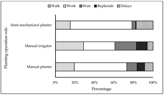 The mean cycle times for the MP, MI, and SMP were 11.6 s, 12 s, and 25.1 s, respectively. In the manual method, planters spent the highest proportion of time performing actual planting work (53.8%) and walking (19.3%). Waiting time was split between waiting for irrigators (10.5%) and seedling replenishing (7.8%). The results show that manual irrigators performed actual productive work only 1/3 of their work time. The remaining time was spent refilling the hydrogel, waiting for the planters to drop the seedlings, driving the tractor with hydrogel closer, and performing other ancillary tasks (Figure 6). In the semi-mechanised method, most of the cycle time was taken by actual work: boring planting holes, inserting the planting tubes, and depositing the seedlings. SMP’s actual planting work accounted for 63.3% of the total cycle time. Moving between planting positions took 15.1% of cycle time. Delay time was highest with SMPs (17.3%) than for MPs (8.7%) and MIs (5.9%). The Kruskal–Wallis test revealed that the proportion of time spent on each task was significantly different for both treatments, except for delays (Table 5).