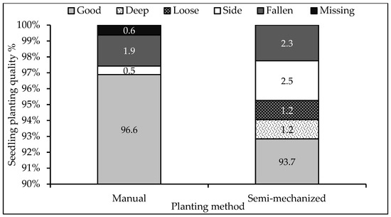 A total of 2037 seedlings were assessed for quality after planting at all the study plots and for both methods. The Chi-Square test (x2 = 1.68; df = 1; p-value = 0.19) did not detect any significant difference in planting quality between the two treatments across both study sites (p-value = 0.19). The success rate (i.e., good planting quality) was 96% for the manual method and 93% for the semi-mechanised method, but the difference was insignificant (p-value = 0.07). For both methods, no seedlings were planted shallow, inadequately compacted, or slanted. The percentage of seedlings planted on the side (2.5%), fallen (2.3%), loose (1.2%) and planted deep (1.2%) were higher with the semi-mechanised method than the manual method (Figure 7). There was no significant difference in the proportion of good-quality plantings between the four teams working at Flatcrown and Kwambonambi in both treatments (manual, p-value = 0.58; semi-mechanised, p-value = 0.81). Survival was 100% at Kwambonambi and 98% at Flatcrown, regardless of planting method; Chi-square analysis failed to find any significant differences in 30-day plant survival between methods or sites (p-value = 0.25).