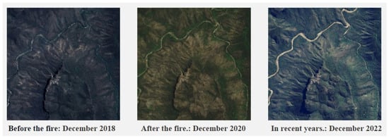 We obtained high-definition satellite images of the area from 2018 to 2023 through the Google Earth Engine platform. Due to the slow growth rate of forest vegetation, the characteristics do not change significantly in a short period of time. Therefore, we extracted thumbnails of some disaster-affected areas from 2018 (before the fire), 2020 (after the fire), and 2022 (three years after the fire) for comparison. As shown in Figure 2, taking forest coverage as an example, we can observe that in 2018, the forest vegetation in the area was lush with a very high coverage rate; after the fire in 2020, the area showed large areas of exposed land, and the forest vegetation suffered devastating damage. Three years later, in 2022, as the ecosystem gradually recovered, the forest vegetation gradually covered the area again.