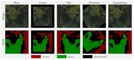 The construction of the semantic segmentation dataset was completed by four annotators. Specifically, we used ARCGIS’s rasterization tool to create underlying features for each original image, then set the classification for forests, water bodies, and the background, and added the polygon features of forests and water bodies to the ARCGIS vector layer. Considering the potential differences in the judgment of forest and water body boundaries by different annotators, the annotation process followed the principle of allowing partial overlap of polygon features at the boundaries of different classifications. The selected four images were preliminarily annotated, which formed the basis of our forest and water body semantic segmentation dataset. Then, we exported the layers with preliminary annotations and generated complete vector maps. Due to GPU memory limitations, the entire original image could not be directly input into the deep learning model for training and inference, so it was necessary to crop the annotated images. The original images were 24-bit color depth TIF format files, which we cropped into RGB channel images using the OpenCV library. The final image files were in JPG format, and the label files were in PNG format. After completing the above process, we selected 945 valid images. The dataset images include elements of forests and water bodies, as well as roads, land, and a few residential areas. The objects segmented in this experiment include forests, water bodies, and the background. The dataset contains original images and annotation data. Red pixels represent forest areas, green pixels represent water body areas, and black pixels represent the background. Each image and label file in the dataset was cropped into 256 pixels × 256 pixels, totaling 1890 pieces. As shown in Figure 3, to improve the model’s generalization ability and robustness, this study used four data augmentation methods to expand the dataset. Each original image was randomly scaled, flipped, rotated, and translated, resulting in a total of 4725 valid images and 4725 annotated images. The dataset was further divided randomly, at a ratio of 8:1:1, to form the training/validation/test sets for subsequent research.