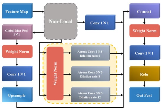 This module is applied to the deep feature extraction stage of the encoder, with its core function being to extract deeper semantic information and fuse features of different scales, thereby enhancing the overall performance of the network. As shown in Figure 4, the CIFM module first uses the Non-Local attention mechanism to capture the global context information on the input feature map and then performs a 1 × 1 convolution and, while applying the Dilation rates of 4, 8, and 12, Atrous convolutions are used to extract features of different scales. Atrous convolutions with different Dilation rates can expand the receptive field and capture a wider range of contextual information. Before applying dilated convolution, we use the Weight Norm to ensure the stability of the weight matrix norm, improving training stability and speed while maintaining the direction of the weight vector. This has contributed to the training and generalization capabilities of the network. Global max pooling is then applied to extract salient features of the image. Another 1 × 1 convolution is applied, and the result is fused with the extracted multi-scale features after upsampling. Weight Norm is applied again to the fused features to reduce noise and redundant information, further mitigating the issues of gradient vanishing or explosion. Finally, a 1 × 1 convolution is used to reduce the number of channels of the feature map, and then Relu is used to output the class probability of each pixel.