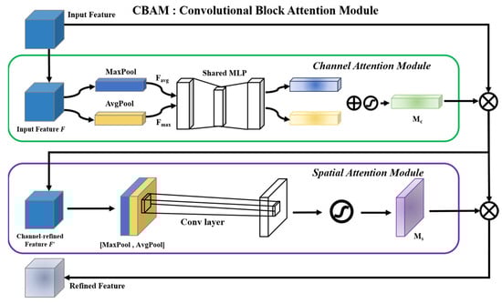 In artificial intelligence and deep learning, the attention mechanism enables models to automatically learn and focus on task-relevant parts. To enhance the model’s baseline performance, we introduced the CBAM attention mechanism module during the initial stage of feature extraction. CBAM enhances the effective information in the feature map by sequentially applying the channel attention module and the spatial attention module. As shown in Figure 5, starting from the channel attention module, feature compression is first performed, and global average pooling and global maximum pooling are performed on the input feature map to obtain two different feature descriptions respectively. The formula can be expressed as follows: