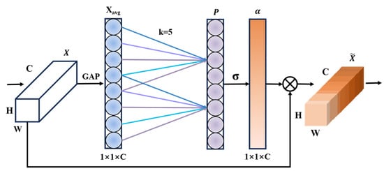 After the CIFM module performs scene information fusion, the network acquires feature information at different scales. In order to further extract local feature information, the ECA attention mechanism is introduced in the fourth and fifth layers of the encoder of the CCE-UNet architecture to improve the network performance and efficiency and assist the CIFM module in integrating scene information. The ECA attention mechanism is a lightweight channel attention mechanism. Its main idea is to use 1 × 1 convolutional layers instead of fully connected layers to learn the dependencies between channels. As shown in Figure 6, ECA first performs global average pooling on the input feature map to obtain a channel-dimensional feature vector , which represents the average activation of each channel.