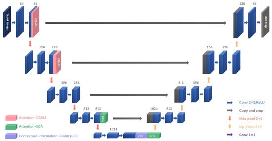 The specific process is shown in Figure 7. First, the input image is passed through the encoder for feature extraction. The encoder consists of five layers, each including a convolution layer and a pooling layer. CBAM is applied after feature extraction in the first and second layers, and ECA is applied after feature extraction in the fourth and fifth layers. After a series of convolution and pooling operations, the image is gradually downsampled while the number of channels is gradually increased. After feature extraction, we obtained five feature maps of different scales. The number of channels in these feature maps gradually increased, reaching 64, 128, 256, 512, and 1024 channels, respectively. Then, we applied the ASPP module to the deepest feature map, which is the fifth layer of the encoder, to capture contextual information at different scales through multi-scale Atrous convolution. Then, in the decoder part, the decoder consists of 4 layers, from bottom to top. We first upsampled and spliced the fourth layer feature map in the encoder, and the fifth layer feature map was processed by the ASPP module to obtain the decoder. The feature map of the first layer is (512 × 512 × 1024). Then, we upsampled and spliced it with the third layer feature map in the encoder to obtain the second layer feature map of the decoder (256 × 256 × 512). Then, we upsampled and spliced it with the second layer in the encoder to obtain the feature map of the third layer of the decoder (128 × 128 × 256). Finally, we upsampled and spliced it with the first layer of the encoder to obtain the feature map of the fourth layer of the encoder (64 × 64 × 128). In this way, the decoder part gradually restores the size of the feature map to the size of the input image and fuses feature information of different scales. At the output layer, we performed a 1 × 1 convolution on the feature map of the fourth layer of the decoder. The entire decoder effectively restores the detailed information of the image through upsampling and splicing operations, achieving accurate segmentation results.
