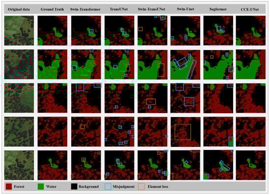 When the forest or water cover is too high or too low, the visualization cannot clearly show the differences between models. Therefore, the experiment selected scenes with a relatively balanced proportion of forests, water bodies, and backgrounds to visualize segmentation results. Among them, the red pixel area is the forest element, the green pixel area is the water element and the content marked by the blue rectangular box is the element with the wrong segmentation. Figure 8 compares the visualization effects of CCE-UNet and CNN-based image segmentation networks. Among them, the baseline model misidentified many forest elements as water elements, while DeeplabV3+ lost a large number of forest elements, and CCE-UNet stood out with its precise segmentation effect.