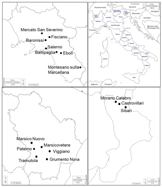Sampling sites in the Campania (upper left), Basilicata (lower left) and Calabria (lower right) regions of southern Italy. All Italian regions are depicted on the (upper right) panel. Maps were created through d-maps.com, accessed on 20 September 2024.