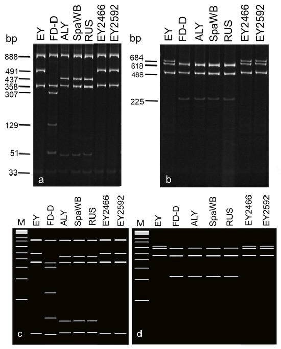 (a) TaqI and (b) BfaI actual and (c) TaqI and (d) BfaI virtual restriction patterns of P1A/P7A fragment from elm yellows (EY) phytoplasma strains and reference strains. EY, elm yellows (strain EY1); FD-D, flavescence dorée (16SrV-D); ALY, alder yellows; SpaWB, Spartium witches’ broom; RUS, Rubus stunt; EY2466 and EY2592, newly detected EY phytoplasma strains in southern Italy (examples). In (c,d), FD-D (strain FD1487); ALY (strain ALY-SI); SpaWB (strain SpaWB229); RUS (strain RUS); M, 1 Kb Plus DNA ladder.