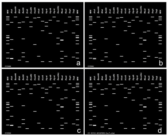 (a–d). In silico (=virtual) restriction analysis carried out according to Zhao et al. [43] with 17 restriction endonucleases of R16F2n/R2 sequences from EY phytoplasma strains detected in the present work (examples) and phytoplasma reference strain EY1. MW, φX174DNA HaeIII digest.