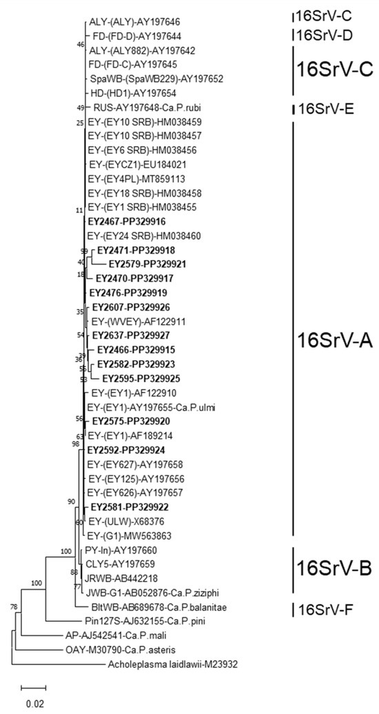 - Lee, I.-M.; Martini, M.; Marcone, C.; Zhu, S.F. Classification of phytoplasma strains in the elm yellows group (16SrV) and proposal of ‘Candidatus Phytoplasma ulmi’ for the phytoplasma associated with elm yellows. Int. J. Syst. Evol. Microbiol. 2004, 54, 337–347. [Google Scholar] [CrossRef] [PubMed]
