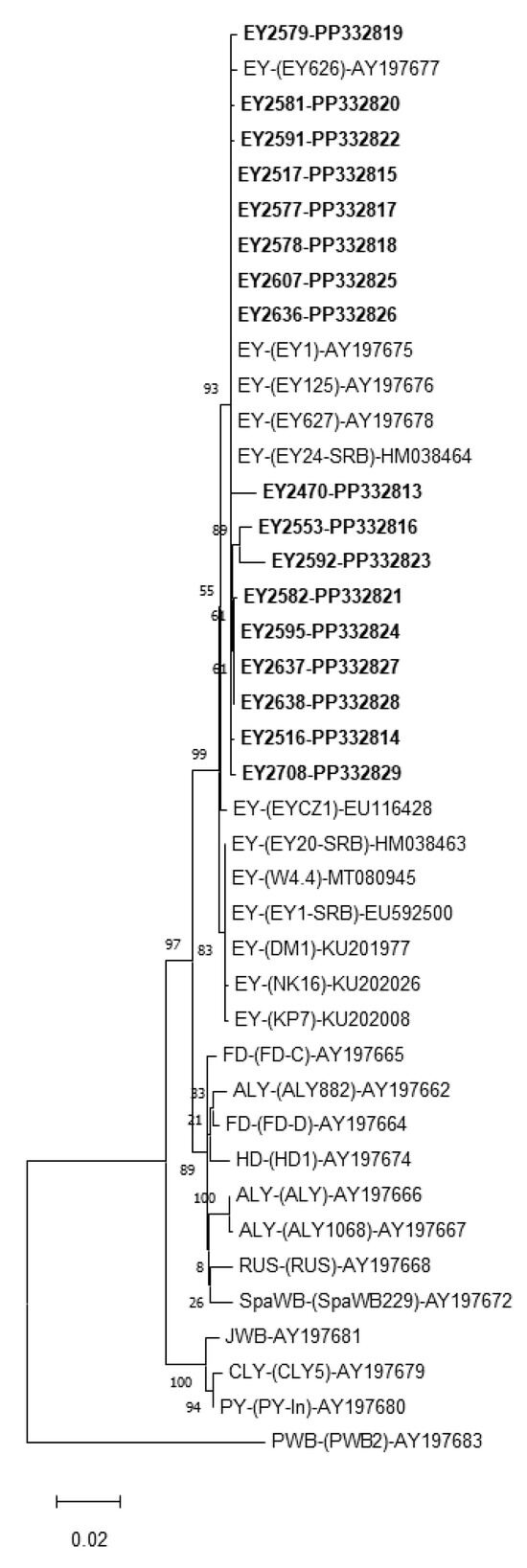 The nucleotide sequence analysis showed that the ND-SI-EY strains shared 16S rDNA sequence similarity varying from 98.5 (EY2579 vs. EY2595) to 99.6% (EY2637 vs. EY2592). Comparisons of these strains with previously reported EY strains revealed sequence similarity values between 98.5 (EY2579 vs. EY1-GenBank accession no. AF122910) and 100% (EY2467 vs. EY24-SRB). Comparisons with members of other 16SrV subgroups showed 16S rDNA sequence similarity values of 97.8%–99.7%, 97.8%–99.7%, 97.8%–99.6%, 97.6%–99.8%, 97.5%–99.3%, 97%–99.2% and 96.2%–97.9% with the ALY, SpaWB, HD, FD, RUS, 16SrV-B (JRWB, PY-In, CLY5 and JWB-G1) and BltWB strains, respectively. The phytoplasmas from the other taxonomic groups differed from the ND-SI-EY strains in more than 6.6% of the nucleotide positions. The phylogenetic relationships of the ND-SI-EY strains at the 16S rDNA sequence level to each other and to other phytoplasmas are shown in Figure 6. The ND-SI-EY strains clustered with other EY strains. At the 16S/23S rDNA level, the ND-SI-EY strains showed similarity values between 95.9 (EY2471 vs. EY2581) and 100% (EY2467 vs. EY2637). Strains EY2467, EY2470, EY2476 and EY2637 proved to be identical to the EY strains EY1 (GenBank accession no. AF189214), EYCZ1 and EY4PL, whereas the remaining ND-SI-EY strains shared 95.1%–99.6% 16S/23S rDNA similarity with other EY strains used for comparison. Within the 16SrVgroup, the strain most distantly related to the ND-SI-EY strains was BltWB (Ca. Phytoplasma balanitae), which shared 93.4%–96.5% 16S/23S rDNA similarity with them. In the phylogenetic analysis, most of the ND-SI-EY strains clustered tightly together, whereas the remaining ND-SI-EY strains clustered with both the American and European EY strains (Figure S3).