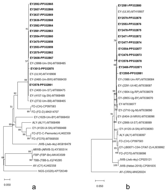 - Lai, F.; Song, C.S.; Ren, Z.G.; Lin, C.L.; Xu, Q.C.; Li, Y.; Piao, C.G.; Yu, S.S.; Guo, M.W.; Tian, G.Z. Molecular characterization of a new member of the 16SrV group of phytoplasma associated with Bischofia polycarpa (Levl.) airy shaw witches’-broom disease in China by a multiple gene-based analysis. Australas. Plant Pathol. 2014, 43, 557–569. [Google Scholar] [CrossRef]