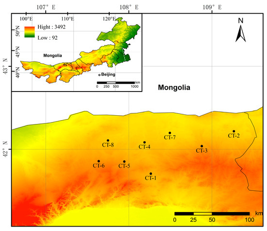 This study investigated C. tibetica scrubs in the shrub-encroached desert grassland area of Inner Mongolia. The study area has a continental monsoon climate, with an annual average precipitation that ranges from 170.84 to 245.62 mm and an annual average temperature that ranges from 3.4 to 7.2 °C. The elevation ranges from 1024 to 1557 m. The soil types are mainly brown calcic soil and light brown calcic soil. The vegetation types are desert steppe and steppified desert. The dominant plants are mainly xerophytes and strong xerophytes, including shrubs such as C. tibetica and C. microphylla. The dominant herbs include Stipa tianschanica var. klemenzii, Stipa caucasica subsp. glareosa, Allium polyrhizum, and Cleistogenes squarrosa.