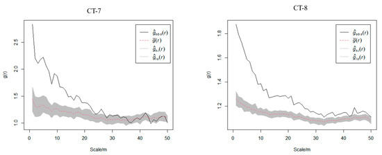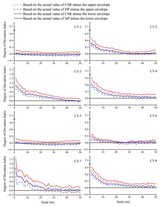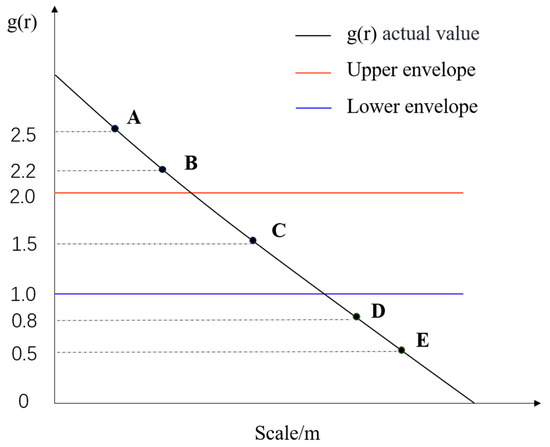 where gi represents the actual g value calculated for the CSR or HP models at scale i, upperi represents the g value of the upper envelope calculated at the corresponding scale, and loweri represents the g value of the lower envelope calculated at the corresponding scale. If both the DoDIupper and DoDIlower > 0, the distribution is aggregated, and a larger difference indicates a higher degree of aggregation. If the DoDIupper < 0 and the DoDIlower > 0, the distribution is random. If the DoDIupper < 0 and the DoDIlower < 0, the distribution is uniform, and a larger absolute difference represents a higher degree of uniformity. Figure 2 shows how the DoDI is calculated.
