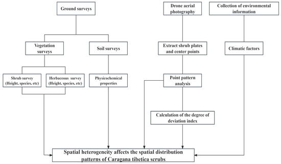 In this study, the spatial distribution patterns of C. tibetica in shrub-encroached grasslands in Inner Mongolia were investigated. Using aerial photographs obtained from an unmanned aerial vehicle (UAV) in conjunction with field surveys, we analyzed the effects of spatial heterogeneity on the C. tibetica population. Our objective was to uncover the characteristics of shrub spatial distribution within shrub-encroached grasslands and to understand how spatial heterogeneity influences these distribution patterns. This integrated approach allows for a comprehensive examination of the factors affecting shrub distribution and provides insights into ecological dynamics in these environments.
