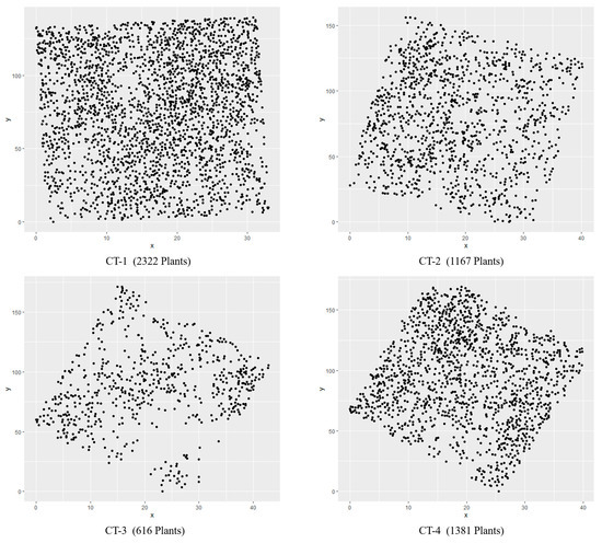 Point pattern analysis (PPA) has been used to study the spatial distribution patterns of populations [21]. PPA can reflect the spatial distribution patterns and characteristics of plant species at different scales and is a robust method [22]. The formula is as follows [23]: