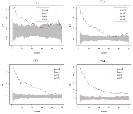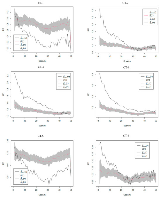 To describe and explain the spatial patterns of plots more clearly, this study used the improved g(r) function. The value of g(r) represents the aggregation strength. When g(r) > 1, there is an aggregated distribution; when g(r) < 1, there is a uniform distribution; and when g(r) = 1, there is a random distribution.