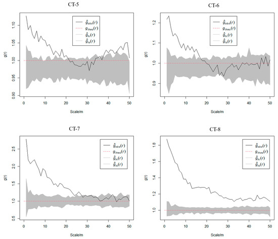 Analysis of the HP null model revealed that the spatial distribution patterns of the C. tibetica scrubs deviated from the HP model to varying degrees (Figure 6). Except for the CT-1 and CT-5 plots, the pattern of the C. tibetica population showed a shift from an aggregated distribution to a random distribution with increasing scale, and the trend was basically the same as that observed for the CSR model.