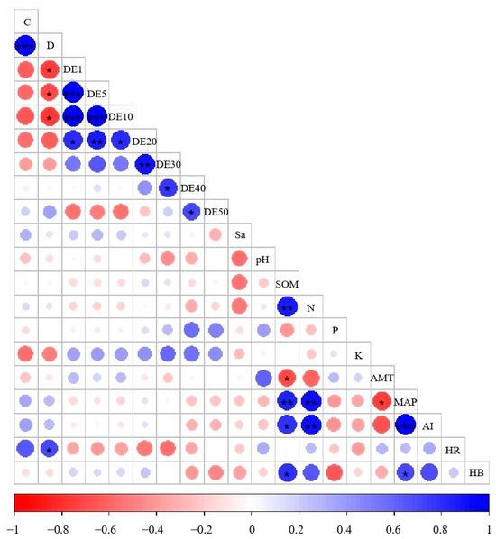 Correlation analysis of the C. tibetica population and environmental factors based on the HP model. “*” indicates significance at the 0.05 level (bilateral), p < 0.05; “**” indicates extreme significance at the 0.01 level (bilateral), p < 0.01; “***” indicates extremely strong significance at the 0.001 level (bilateral), p < 0.001. C—thicket coverage; D—thicket density; DE1, DE5, DE10, DE20, DE30, DE40, DE50—degree of deviation in the spatial distribution of populations in 1 m, 5 m, 10 m, 20 m, 30 m, 40 m, 50 m; Sa—sand content; pH—soil pH; SOM—soil organic matter; N—soil available nitrogen; P—soil available phosphorus; K—soil available potassium; AMT—average annual temperature; MAP—average annual precipitation; AI—drought index; HR—richness of herbaceous species; HB—herbal biomass.