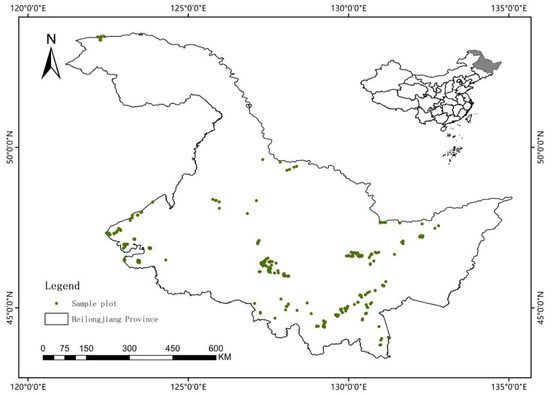 The present study selected data for fixed sample plots of the Mongolian pine plantation in several areas of Heilongjiang Province (121°11′–135°05′ E, 42°36′–53°33′ N). The main topographical features of these areas include mountains, hills, and plains. The study area falls into a monsoon climate zone with an average annual temperature of 0 ± 5 °C, moderate annual precipitation of between 500 mm and 800 mm, a clear seasonal distribution, and a frost-free period of ~128 days. The main types of forest vegetation are broad-leaved and coniferous forests, mainly distributed in the Daxing’an, Xiaoxing’an, Laoye, and Zhangguangcai mountains. The northern part of the Daxing’an Mountains hosts a cold temperate coniferous forest, whereas the remaining study areas host temperate coniferous and broad-leaved mixed forests. The area of Mongolian pine forests in Heilongjiang Province is ~296,800 ha, whereas the total forest area is ~19,844,000 ha [31].