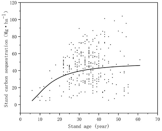 Total stand C sequestration increased with increasing stand age (Figure 3), consistent with the results of Zhao et al. [73]. Hudiburg et al. identified the relationships between the upper limit and average for biomass and stand age to estimate the C stock of forests in Oregon and Northern California [74], obtaining results consistent with those of the present study; Aguila proposed that the peak in C sequestration of stands of a Red Cone plantation in Guangdong occurred between 6 and 10 years old, slightly different from the peak C density occurring at 14 years in the present study. This difference can possibly be attributed to the influence of regional climate and biological characteristics of tree species [75], whereas the two studies obtained similar peak C density in young forest stands.