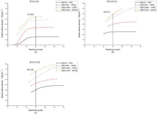 The sample plots were sorted according to SCI size and divided into three groups of (6, 10], (10, 12], and (12, 18], each containing 130 plots. Each SCI group was further divided into four intervals according to the SDI, namely (0, 500], (500, 1000], (1000, 1500], and (1500, 3500]. C density versus stand age curves were then plotted for different SDI levels within each SCI group. Maximum stand C density (30 years in age) was 53.85 Mg·ha−1 in the (6, 10] SCI interval (Figure 3a), 58.77 Mg·ha−1 in the (10, 12] interval (Figure 3b), and 66.18 Mg·ha−1 in the (12, 18] interval (Figure 3c). Under an SCI of (6, 10], stand C density tended to level off with increasing stand age. The growth rate of carbon density decelerated 25 years of age (Figure 3a). The carbon density of high density stands (10, 12) and (12, 18) increased rapidly with the increase in forest age. The carbon density of low-density stands gradually reached saturation at 25 and ~40 years, respectively (Figure 3b,c).