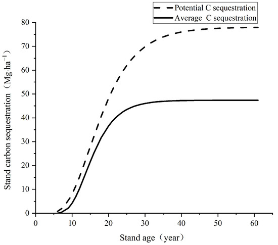 The potential C sequestration rate exceeded the average C sequestration rate, with this difference representative of the potential increase in the C sink function of Mongolian pine. The total potential and average C sequestration of Mongolian pine plantation forest were 77.88 Mg·ha−1 and 47.36 Mg·ha−1, respectively, during the 60-year growth period, with the difference reaching 30.52 Mg·ha−1. The mean annual potential and average C sequestration rates were 1.3 Mg·ha−1·year−1 and 0.79 Mg·ha−1·year−1, respectively, with the difference reaching 0.51 Mg·ha−1·year−1. This result further confirmed the large C sequestration potential of Mongolian pine. Therefore, the effective management of the existing plantation of Mongolian pine can improve C sequestration capacity.