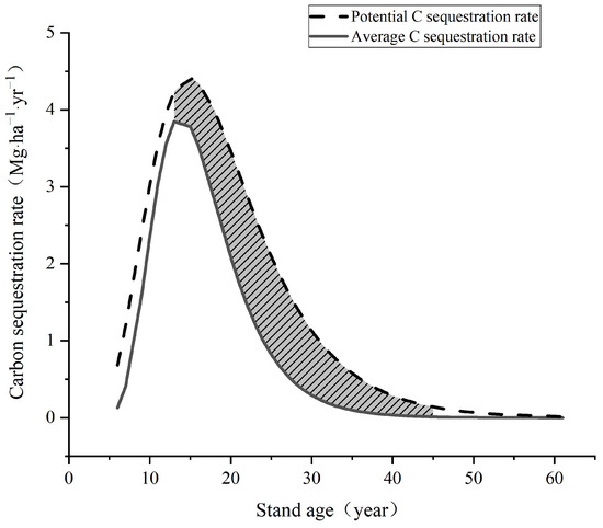 As shown in Figure 5, the C sequestration rate curve was plotted with age and C sequestration rate as the horizontal and vertical coordinates, respectively. The potential C sequestration rate of the Mongolian pine plantation reached a peak of 4.42 Mg·ha−1·year−1 at ~15 years and an average C of 3.86 Mg·ha−1·year−1 at ~13 years, coinciding with the highest C sequestration capacity. A difference between the average and potential C sequestration rate was observed, representing the age-related difference in the C sink capacity of the Mongolian pine forest stand. As also shown in Figure 5, the difference between the average C and potential C sequestration rate of the Mongolian pine plantation was small, between 5 and 13 years. In contrast, the difference increased significantly between 13 and 45 years (shaded area in Figure 5). The shaded area represents the potential increase in carbon sequestration.