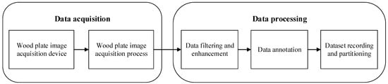 Since the experiment is being conducted in a real industrial environment, the primary issue to address first is the collection of wood plate image data. An important consideration is that the data collection process must account for the operation of the wood bark removal equipment, ensuring that the experiment is conducted while maximizing its profitability. Additionally, the conveyor belts of the wood bark removal equipment operate at high speeds, making manual image capture methods impractical. Therefore, our main goal is to develop a device capable of automating data collection in a real industrial environment. The entire process of acquisition, including the post-processing steps, is depicted in Figure 1.