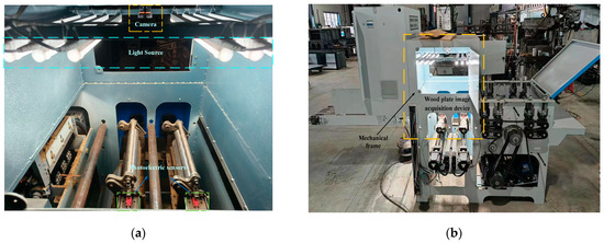 Wood plate image acquisition device. (a) Inside wood plate image acquisition device; (b) Assembled wood bark removal equipment.