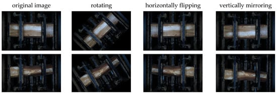 During a data collection process lasting several hours, we obtained a total of 1772 images of wood plate. To improve the efficiency of image acquisition in a high-speed environment, where the process is continuous, challenges such as empty conveyances or overlapping board conveyances can lead to the capture of images that do not meet annotation requirements. After manually removing some blurry, low-quality, and obscured images, the dataset was reduced to 1621 images. To expand the dataset, we employed data augmentation techniques by rotating, horizontally flipping, and vertically mirroring the original images, thereby expanding the dataset to 4863 images. Through data augmentation, the diversity of training data for wood plate is increased, making it more representative and enhancing the model’s generalization ability while reducing the risk of overfitting. Moreover, to address potential issues arising from insufficiently capturing the variability introduced by data augmentation, we conducted multiple rounds of wood plate image acquisition by varying work scenarios, adjusting camera brightness, and changing object conveyance angles. This approach better covers the true distribution of the data, reducing biases introduced by data augmentation and enhancing image variability. Figure 3 depicts examples of data augmentation operations applied to two different sets of wood plate images.