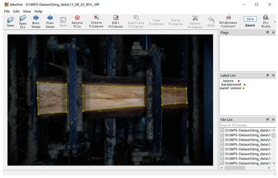 Furthermore, LabelMe supports various annotation shapes such as polygons, rectangles, circles, polylines, line segments, and points (suitable for tasks like object detection and image segmentation). After considering the impact of annotation methods on annotation efficiency for our dataset, we decided to use the polygon annotation method to complete the annotation process, as shown in Figure 4. We manually drew desired board regions on the wood plate images using the polygon drawing button on the toolbar and added labels to the enclosed regions using the label panel on the right. The annotation information for each processed image in the dataset was then saved as a JSON file.