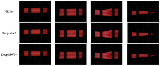 To visually demonstrate and validate the usability of the WPS-dataset, we compared the predicted masks from all listed models with the Ground Truth through visualization. Due to the large number of predicted images of wooden plates, only four sets of wood plate images are selected with different shapes as examples; the predicted masks obtained from experiments on the WPS-dataset are shown in Figure 6.