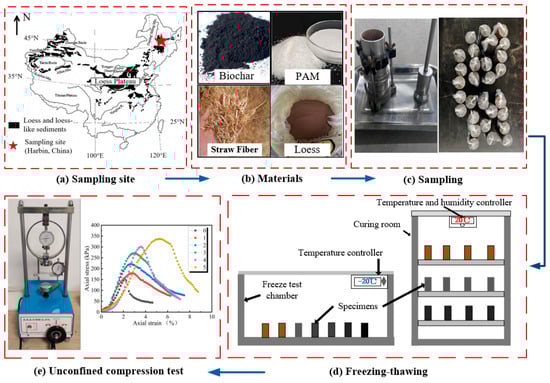 The soil utilized in this work was collected from a forest road construction project on loess-like sediment in Harbin, Heilongjiang Province, China (Figure 1a). Following the standard guidelines of JTG-E40 [], a series of laboratory tests were carried out to obtain several basic engineering properties, as shown in Table 1. Sieve analysis of the soil disclosed the grain size distribution as 0.5% gravel, 3.6% sand, 84.7% silt, and 11.2% clay. The specific gravity, plastic limit, and liquid limit of the soil are 2.71, 15.5%, and 28.3%, respectively. According to the unified soil classification system, the soil can be classified as low-plasticity clay (CL).