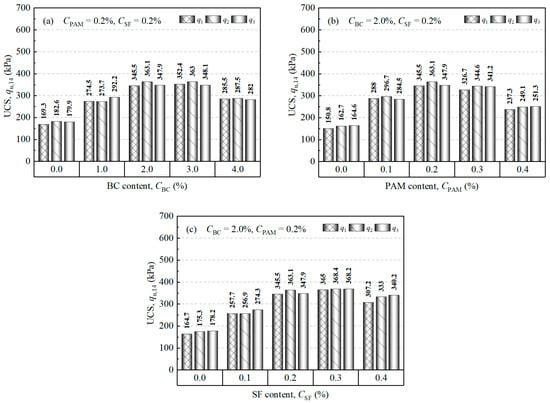 UCS of sample under the influence of (a) BC, (b) PAM, and (c) SF.