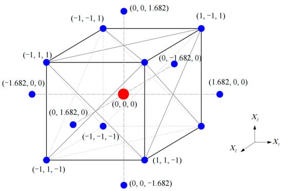 where  is the coding value of the input variable ;  represents the input variable at the center point; and  is the step size of the input variable. Referring to the research results of pioneers [], five levels (−1.682, −1, 0, 1, 1.682) for each input variable were set. The sets of ranges of these variables were determined in terms of the single mixing experiment. According to Equation (2), an experimental program for the UCS test can be established (Table 3 and Figure 3).