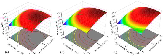 The connections between the output and input variables were illustrated by constructing corresponding surfaces in a three-dimensional (3D) plot. Figure 4a displays the interaction effects between BC and PAM at a fixed SF content of 0.2% (central level). It was observed that UCS presented a parabolic trend with the increase in BC content under a certain PAM level, attaining the maximum at about 0.23% dosage of PAM. A parabolic trend of UCS with the increase in PAM content was also observed, achieving the largest value at about 2.75% dosage of BC. This was consistent with the observation of Wang et al. [], who reported that BC incorporated with suitable PAM (about 0.1%) could bring better amendments to the soil. The contours in Figure 4b,c show the interaction of BC–SF and PAM–SF on the UCS with 14 days of curing, which also exhibited parabolic trends. A low level of SF resulted in a significant decrease in UCS, while a higher UCS was observed with an SF content ranging from 0.2 to 0.3, within which better-stabilizing effects of BC or PAM could be obtained. The pronounced effect of SF is because SF can provide direct tensile strength inside the soil, which will be strengthened by the added BC and PAM.