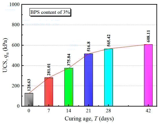 To accommodate the multiple uses of BPS in engineering practice, the effects of curing age, BPS content (), and FT cycles on compressive strength were comprehensively investigated. Figure 5 shows the UCS of soil with 3% BPS cured at 0, 7, 14, 21, 28, and 42 days. It is observed that the increase in strength before curing for 28 days presented a fast and near-linear pattern, while the increase in the further curing period became insignificant. The total strength growth in the first 28 days of curing reached 340% (from 128.63 kPa to 565.42 kPa), and the average growth rate was around 12% per day, while as the curing age increased from 28 days to 42 days, the strength just increased by 7.55%, and the growth rate was only 0.54% per day. Thus, it could be concluded that the period of curing exerted a significant effect on BPS-stabilized soil, and 28 days of curing is recommended in field applications. The strength growth during the curing period was mainly due to interactions between additives (i.e., biochar, PAM, etc.) and soils (i.e., mineral, organic matter, etc.), forming macroaggregates and leading to higher mechanical performance [,,]. The specimens for the following investigation on the effects of BPS dosage and FT cycles were cured for 28 days.