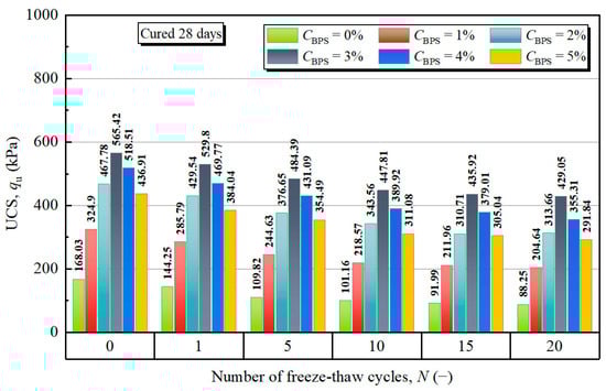 This work also investigated the mechanical performance of soil stabilized with the optimized dosages under freeze–thaw (FT) cycles. In this series, the samples after curing were exposed to cyclic freezing and thawing in a programmable temperature-controlled chamber (Figure 1d). The freezing/thawing process was conditioned at −10 °C and 20 °C, respectively. Each process lasted for 12 h to achieve a uniform temperature []. The freezing/thawing process was supposed to be repeated 20 times. Thereafter, the strength of these samples was determined from the UCS test previously mentioned.