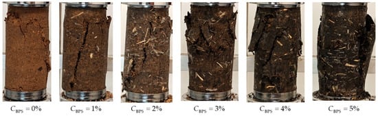 Figure 6 presents the compressive strength of BPS-treated specimens subjected to different numbers of FT cycles. It can be observed that the UCS increased significantly as BPS dosage from 0 to 3%, and thereafter slightly decreased with further BPS addition. That granted the maximum UCS of 565.42 kPa, 529.8 kPa, 484.39 kPa, 447.81 kPa, 435.92 kPa, and 429.05 kPa for 0, 1, 5, 10, 15, and 20 FT cycles, respectively. These maximum values were achieved at a BPS dosage of 3%, which was ascertained as the optimum dosage for soil stabilization. The “rise–fall” pattern of UCS with BPS dosage can be attributed to the dual effects of its components (i.e., BC, PAM, and SF) at high dosage levels, which is discussed in Section 3.1. Figure 7 presents the failure characteristics of BPS-treated soil with varying dosages. It is clear that short and narrow tension cracks were generated in the cases of around the optimum dosage (3% and 4% BPS addition), which can be high-strength prone. However, in other cases, straight and broad vertical cracks were generated on the soil samples during compaction. In sum, the appropriate addition of BPS can change the brittleness of soil samples and bring strength to growth.