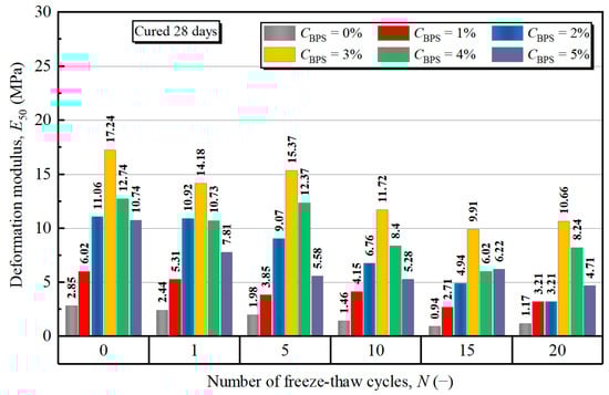 The deformation modulus, , is commonly used to represent the deformation characteristics of soils under stress. It is the secant modulus at half of the failure strain and can be obtained from the UCS test. Figure 8 depicts the deformation modulus of BPS-treated soil samples after FT cycles. Generally, the deformation modulus was within the interval of 0.94–17.24 MPa. As the addition of BPS from 0% to 3%,  of samples subjected to 0, 1, 5, 10, 15, and 20 FT cycles increased by 504.9%, 481.1%, 671.2%, 702.7%, 954.3%, and 811.1%, respectively. Like the UCS, further addition of BPS up to 5% resulted in a stiffness loss of around 37.2% to 63.7%. It can be concluded that a moderate amount of BPS was beneficial for stiffness development. The rising increase rate of  with FT cycles indicated the better effect of BPS under FT circumstances.
