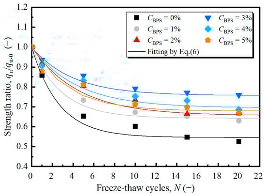 In this study, a strength ratio  was introduced to reflect the influence of FT cycles on the strength of the BPS-treated soil.  is the UCS of samples subjected to FT cycles;  is the pre-freezing–thawing value of . Figure 10 illustrates the effect of FT cycles on the strength ratio for various BPS and FT cycles. The detrimental effect of FT on strength is well represented by the declining trend of . With cyclic FT, the  took the maximum decreasing rate at the first cycle, and decreased with lower rates in the subsequent cycles. After about 10 FT cycles, the decrease in durability index became quite gentle. This suggests that a balance was preliminarily achieved under the FT circumstances.