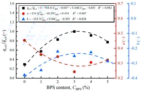 In Equation (6), the parameters , a, and b can be estimated from their correlation with BPS content.  is a standard value of , selected as the value at  (i.e., 565.42 kPa). Figure 11 illustrates the variations of , a, and b against . Using regression analysis, the equations for these parameters were established (Figure 11). The high R2-values ranging from 0.838 to 0.982 indicate the strong correlations between these factors.