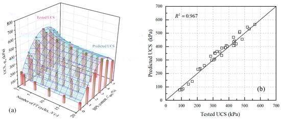 Figure 12 shows the tested and estimated UCS represented by bar figures and surface meshes, respectively. It was seen that the predictions by Equation (7) agreed well with the tested results. The determination coefficient was an acceptable value of 0.967. Therefore, it could be concluded that the proposed model is capable of predicting the UCS of BPS under FT circumstances.